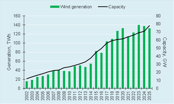 In fact Germany, which is the largest EU country in terms of wind generation, has seen its actual wind generation decrease over the last two years, from its peak of 139.9TWh in 2023 (to 137.5TWh in 2024 and 132.4TWh in 2025). Meanwhile wind capacity increased from 69.1GW in 2023 to 70.8GW in 2024 and we estimate 72-73GW in 2025.