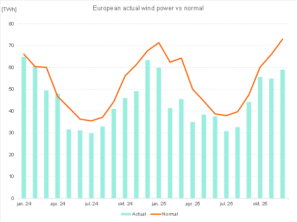 But at a EU+ UK level, our colleagues from Volue Data & Forecasts calculate that in 2025, wind generation underperformed by a significant 120TWh vs. what could have been expected based on capacity and normal weather conditions. The under-performance was mainly noticeable during the winter months.